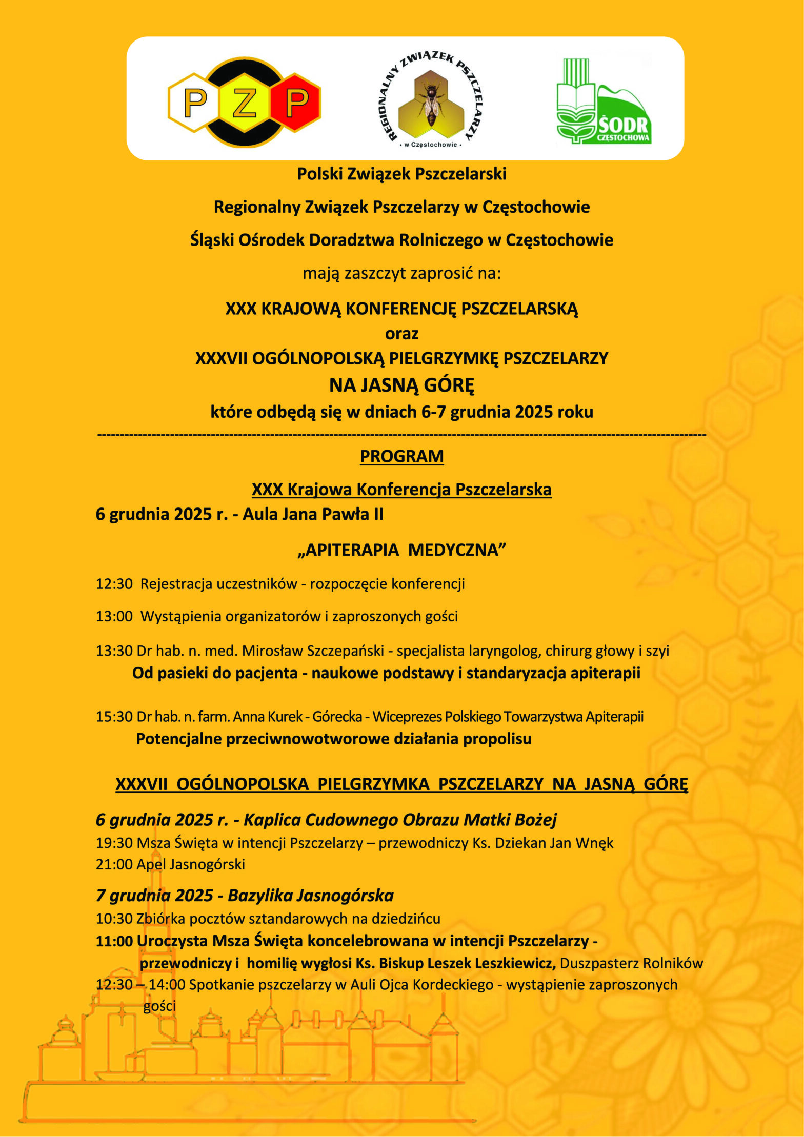 Szkolenie dla pszczelarzy i osób planujących założenie pasieki realizowane przez RZP w Częstochowie w ramach dofinansowania na rok 2026 ze środków ARiMR : Prowadzący:Dr Benedykt Polaczek „Współczesna gospodarka pasieczna – pszczoły miodne, zasady hodowli, choroby” inż. Elżbieta Kalita„Marketing produktów pszczelich w sprzedaży bezpośredniej” Terminy szkoleń: – 07.02.2026 r. – Kalety , osoba odpowiedzialna Arkadiusz Kopyciok tel. 604587062–… Czytaj dalej Szkolenia w ramach dofinansowania ARiMR